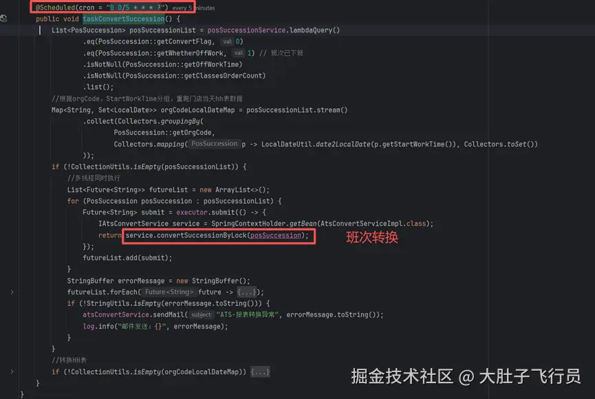 后台服务班次转换通过定时任务,每五分钟执行一次,每日1000班次,要跑将近4,5小时,平均下来1分钟仅能跑几个班次。单个班次执行约20-30s。班次转换速率严重滞后,月底重跑多天报表,可能严重拖慢报表生成进度。