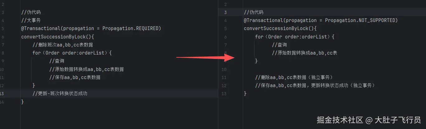 将大事务拆分成小事务,查询和转换方法执行后,再进行数据库事务操作,防止大事务长时间持有占用JDBC连接。具体操作如下: