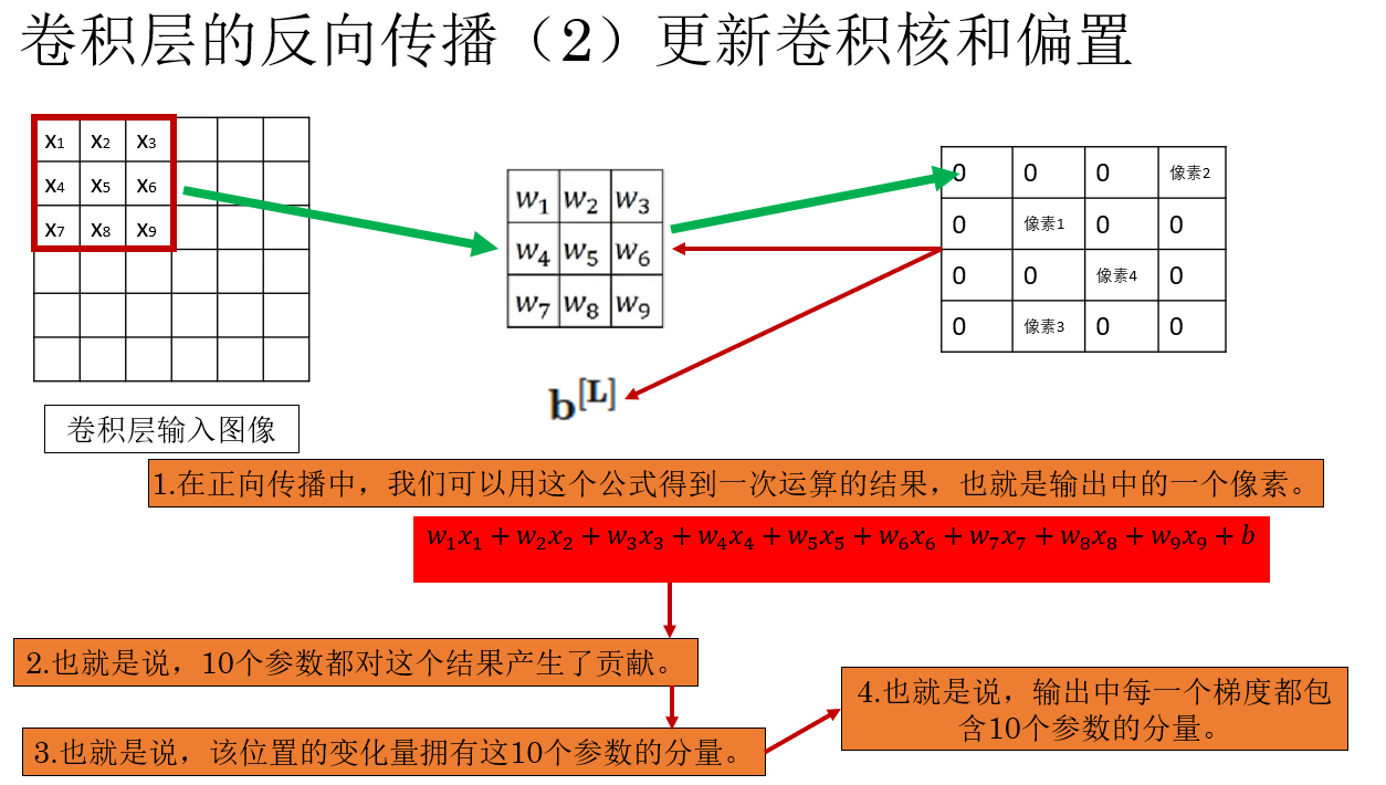 没错,因为输出特征图中的每一个像素都是由卷积核与输入图像的区域运算后再加上偏置得到的,那么就代表反向传播计算得到输出中每一个像素的梯度都和 9 个卷积核参数与 1个偏置常量相关。