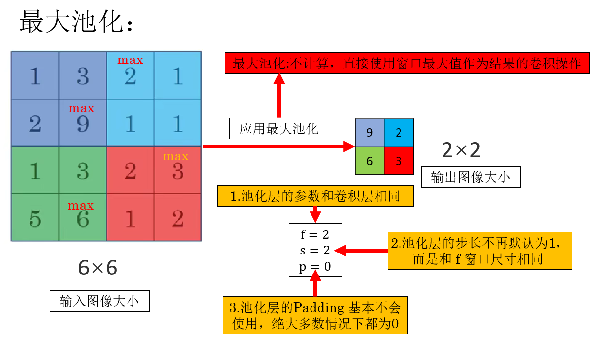- 最大池化:不计算,直接使用窗口最大值作为结果的卷积操作。