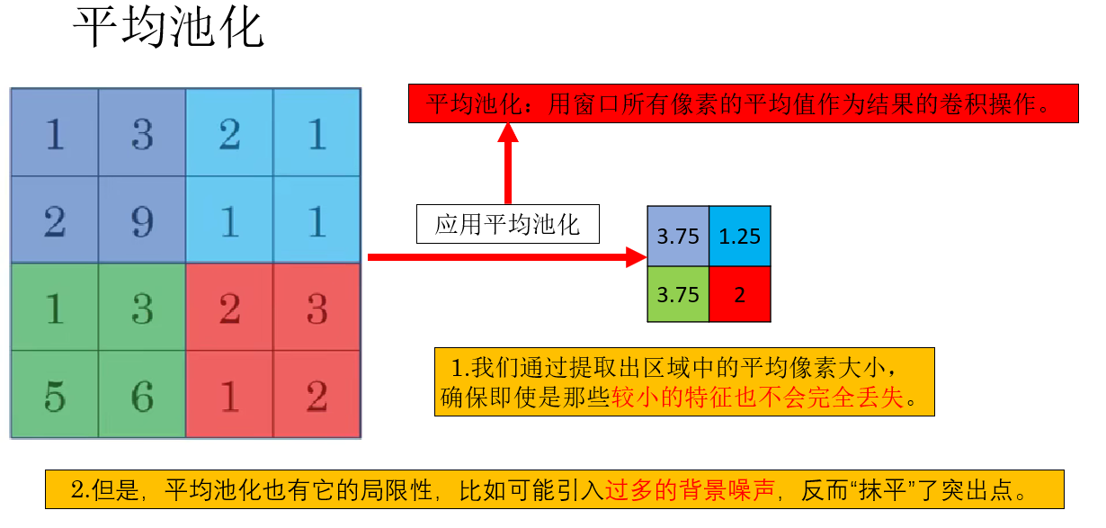 - 平均池化:用窗口所有像素的平均值作为结果的卷积操作。