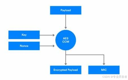 图 1 展示了一个明文载荷(可能来自蓝牙网状网络层或上层传输层),结合输入的加密密钥、随机数与明文载荷,经 AES-CCM 处理后,输出加密载荷与 MIC 的流程。