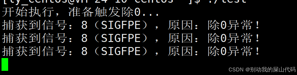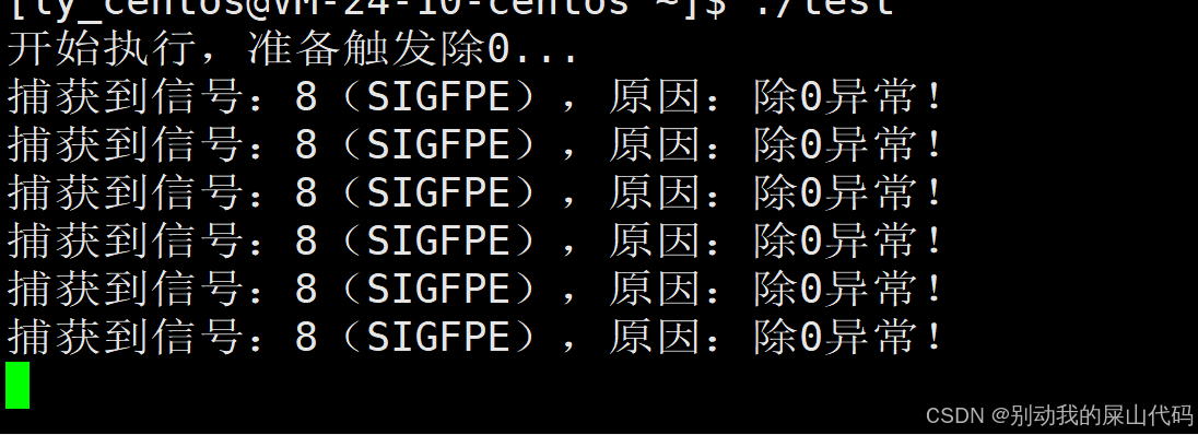 处理函数只 "响应" 了信号,没 "解决" 触发信号的除 0 问题,所以除 0 代码会被反复执行,信号也反复触发。