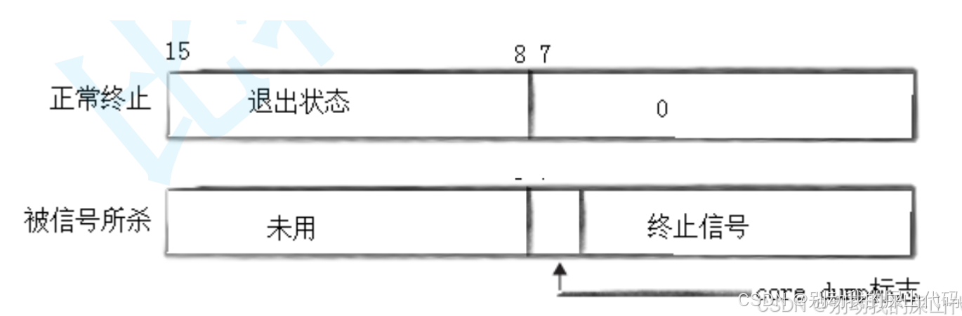 正常终止:高 8 位存exit()的返回值,低 8 位全 0;