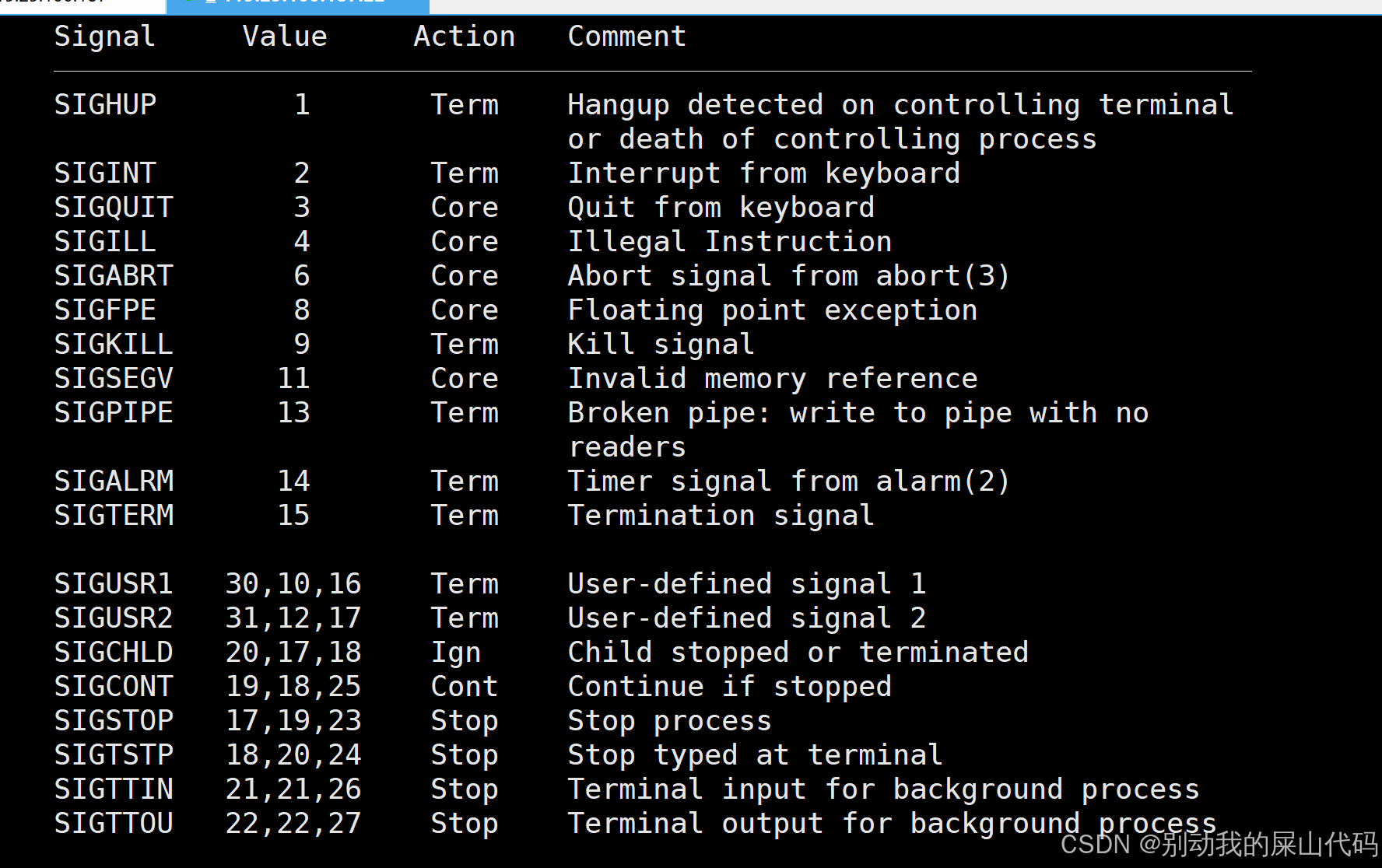 编号范围:1~31 号(对应你列表里的 1) SIGHUP 到 31) SIGSYS)