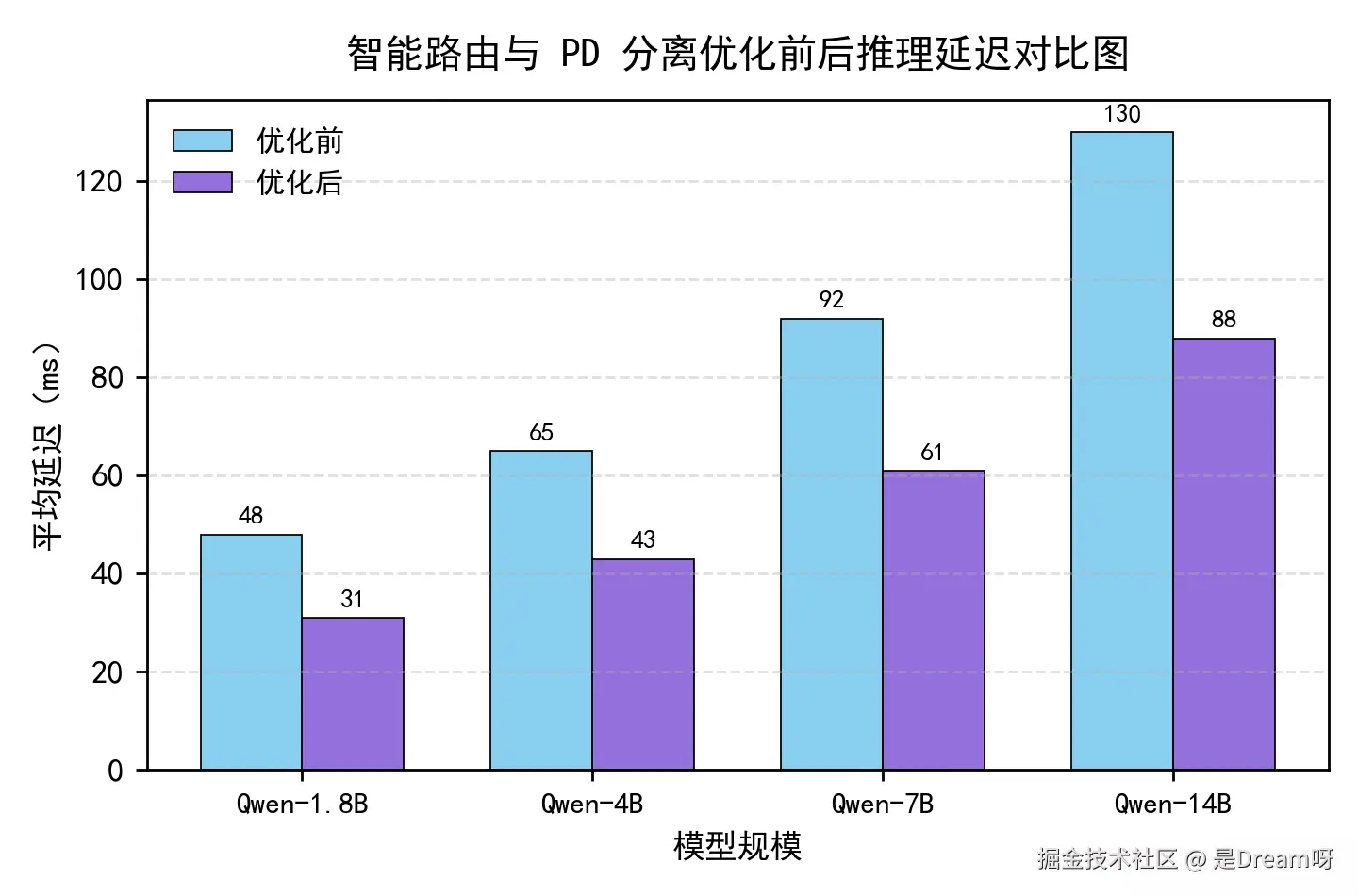 由上图可见,经过 PD 分离与智能路由的优化后,openFuyao 在多规模 Qwen 模型上的推理延迟显著下降。例如,在 Qwen-14B 模型上,平均延迟由 130ms 降至 88ms,整体性能提升约 32%。这得益于系统在路由调度与 KVCache 分布式访问策略上的协同优化。