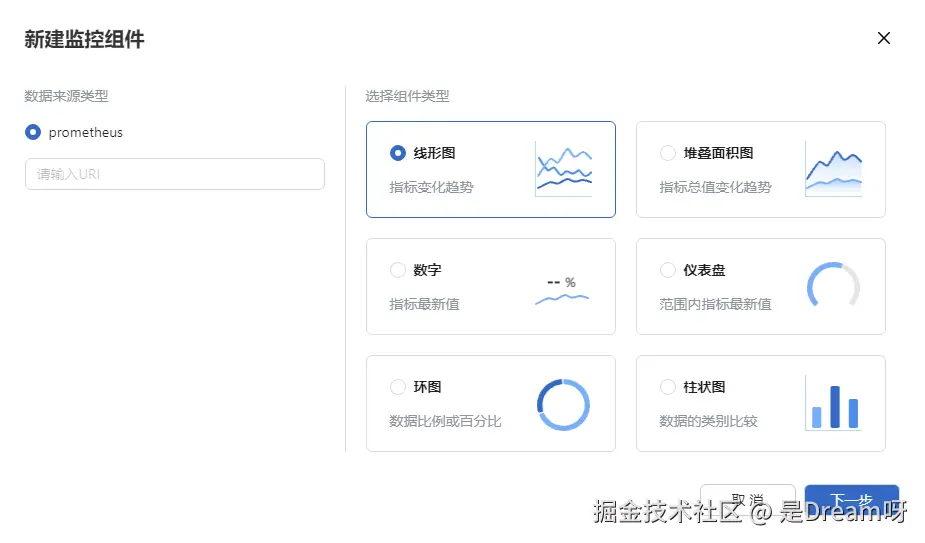 新建监控组件。可在 Dashboard 页面直观查看推理服务负载、节点利用率及任务分布情况。