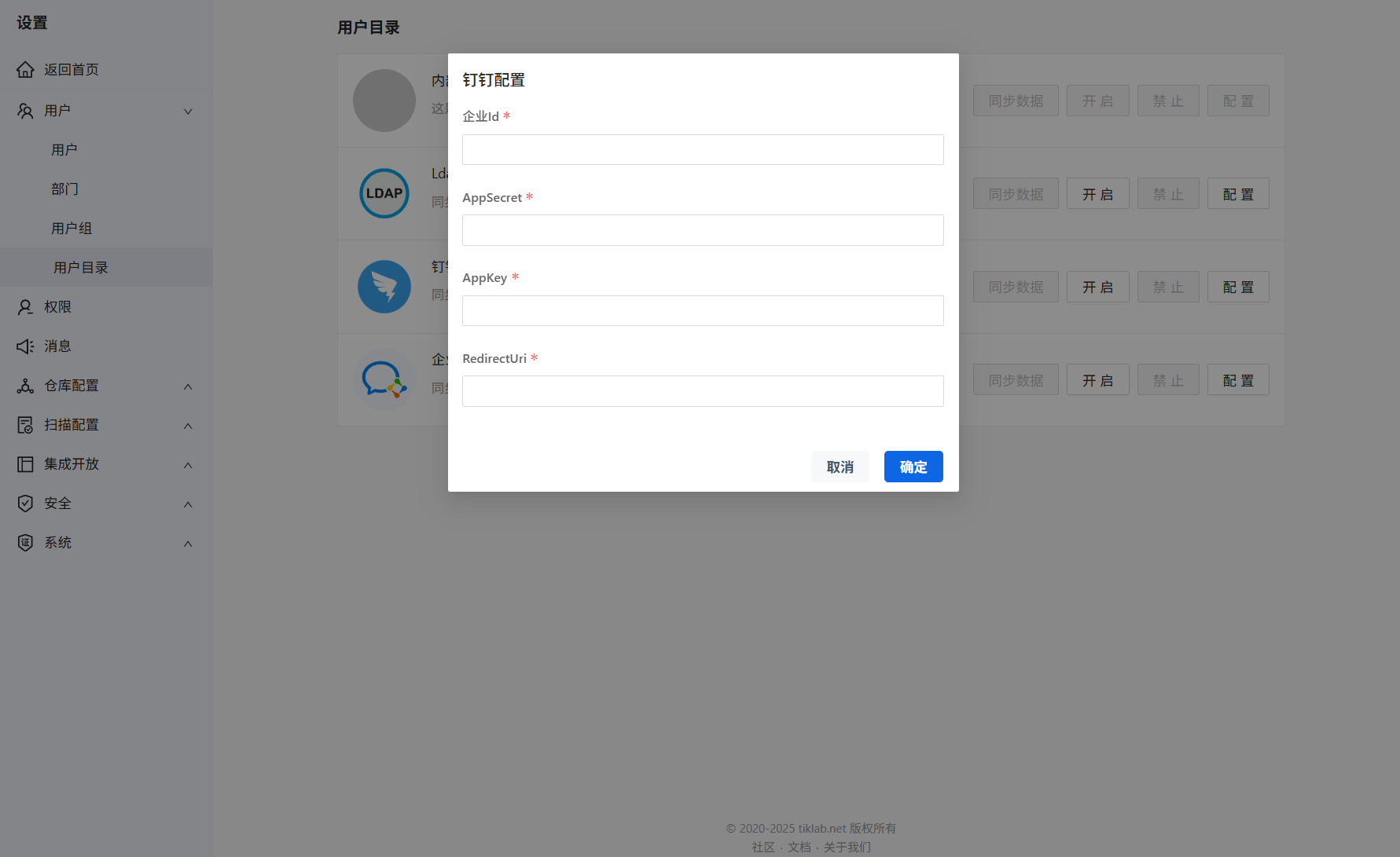 配置钉钉登录,首先需要填写钉钉的信息,开启钉钉配置后即可同步用户信息及登录。