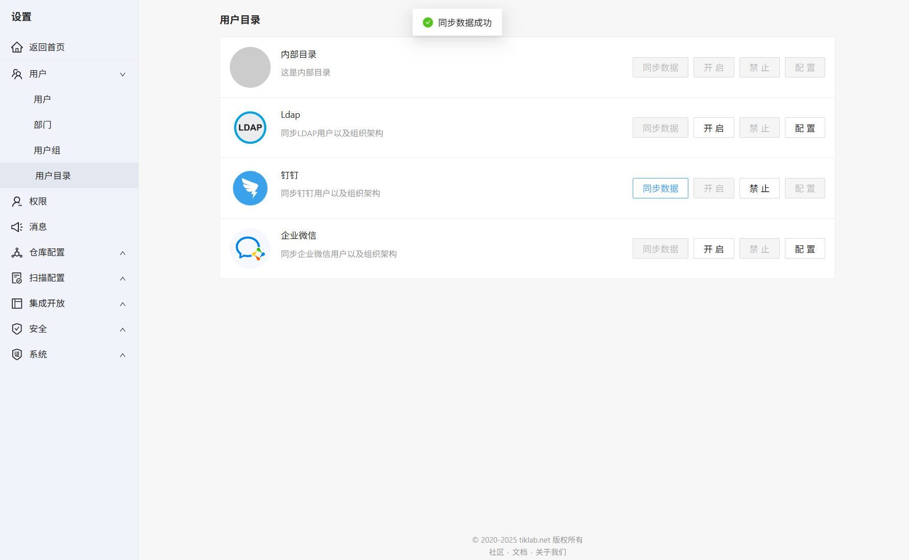 配置成功后点击开启,此时同步数据的按钮会亮起,点击同步数据,就会把钉钉下的用户信息同步到gitpuk。