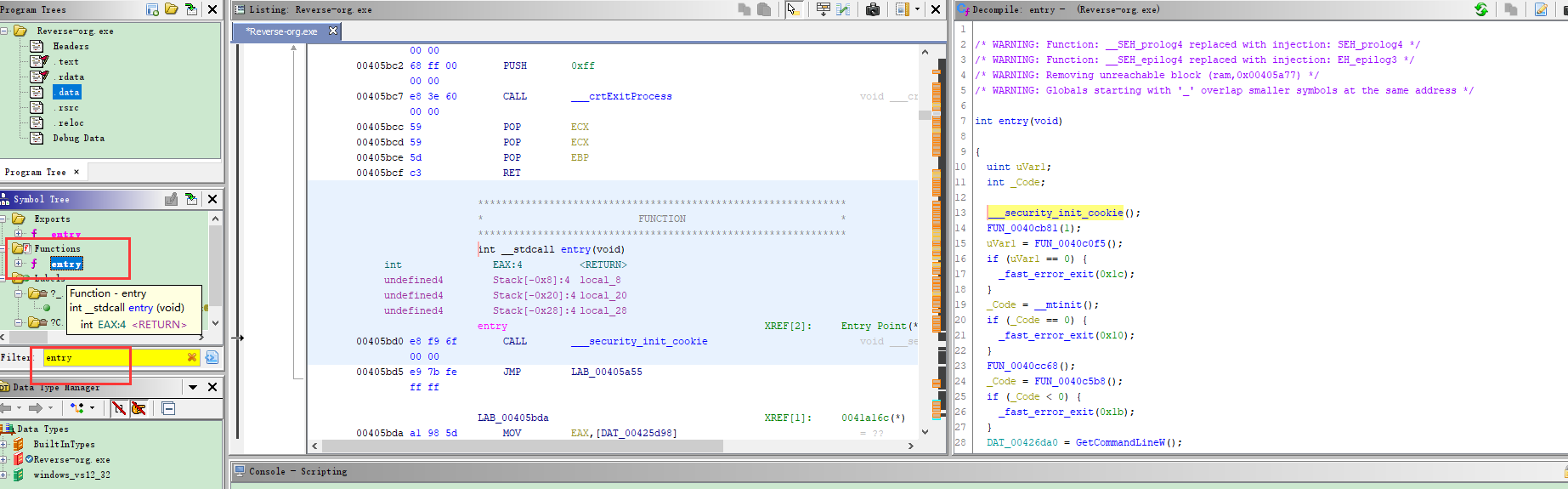 我们可以找到左边的functions,找到entry(当然有些程序直接有main,或者_start等关键字)