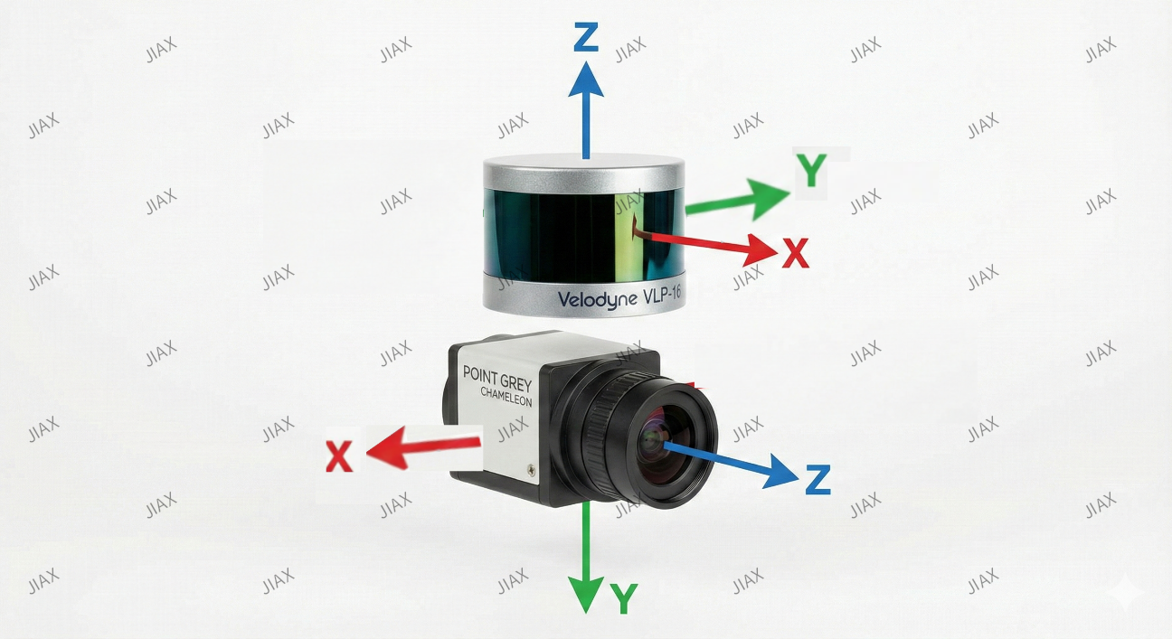 代码中还将相机坐标系的点转换到雷达坐标系。因为通常相机的Z轴指向正前方,激光雷达的Z轴指向正上方,如图所示: