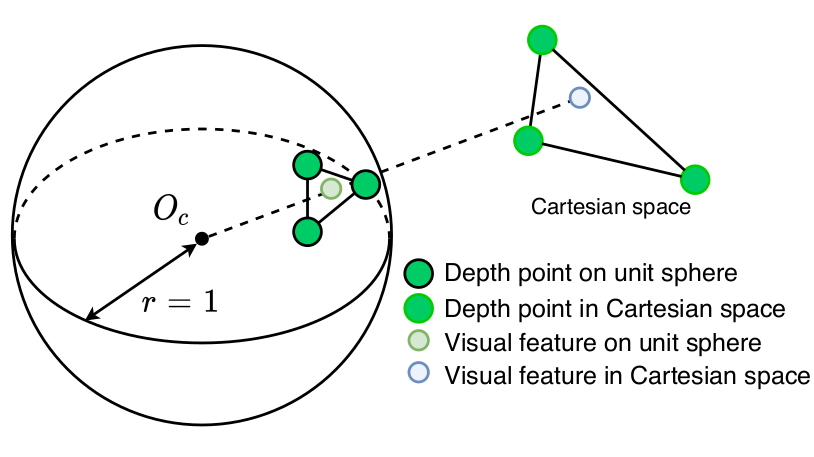 代码遍历投影至单位球面上的视觉特征点,利用 KDTree 搜索出单位球面上距离当前视觉特征点最近的三个激光点。球面投影示意图: