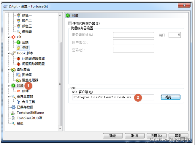 最重要的一步找到 ssh.exe,否则的话会报各种各样的错误,有权限不足,有让你输入git账户密码的,因为小乌龟和git有一定冲突默认路径是C:\Program Files\TortoiseGit\bin\sshaskpass.exe需要改成C:\Program Files\Git\usr\bin\ssh.exe