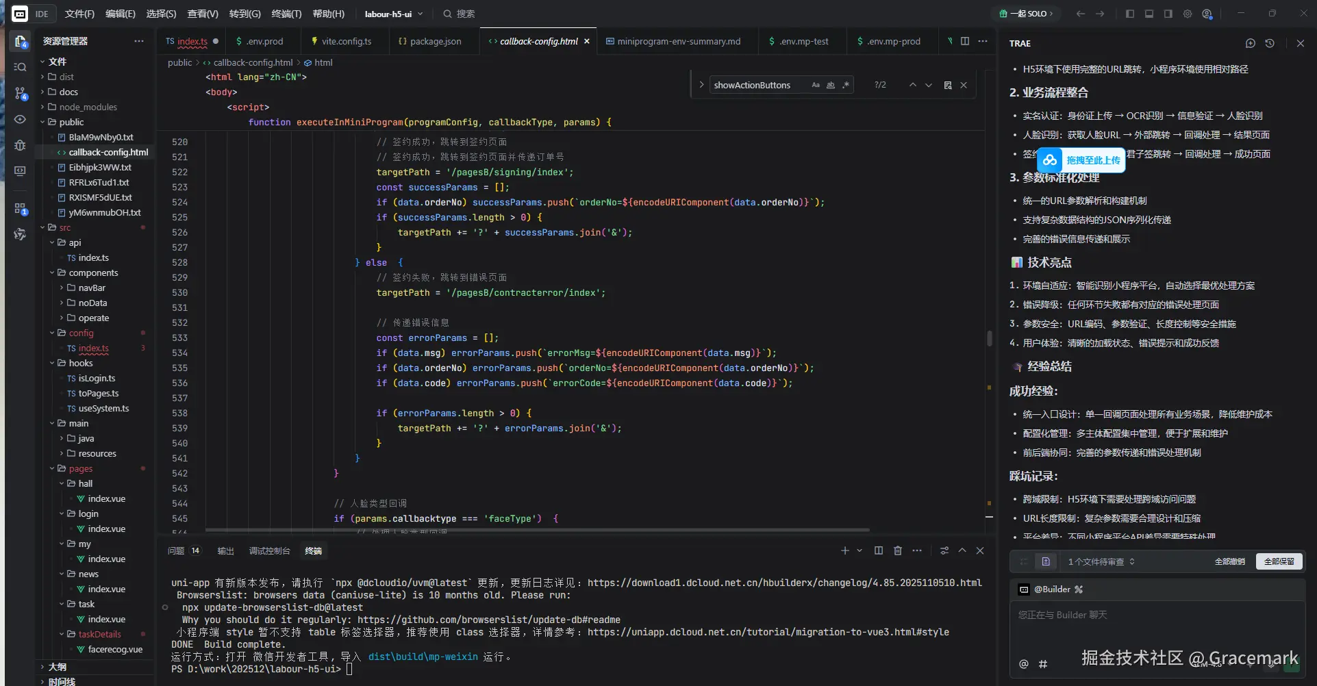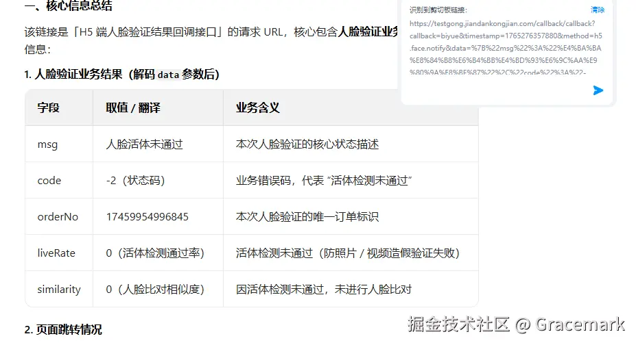 通过本次回调页的开发与调试,成功解决了H5环境下签约跳转失败的问题,修复了参数处理、路径构建等多个关键bug。整个过程展示了良好的问题定位、分析和解决能力,同时也积累了宝贵的前端调试和跨环境开发经验。在未来的开发中,应进一步加强边界情况处理、参数验证和测试覆盖,提高代码质量和系统稳定性。