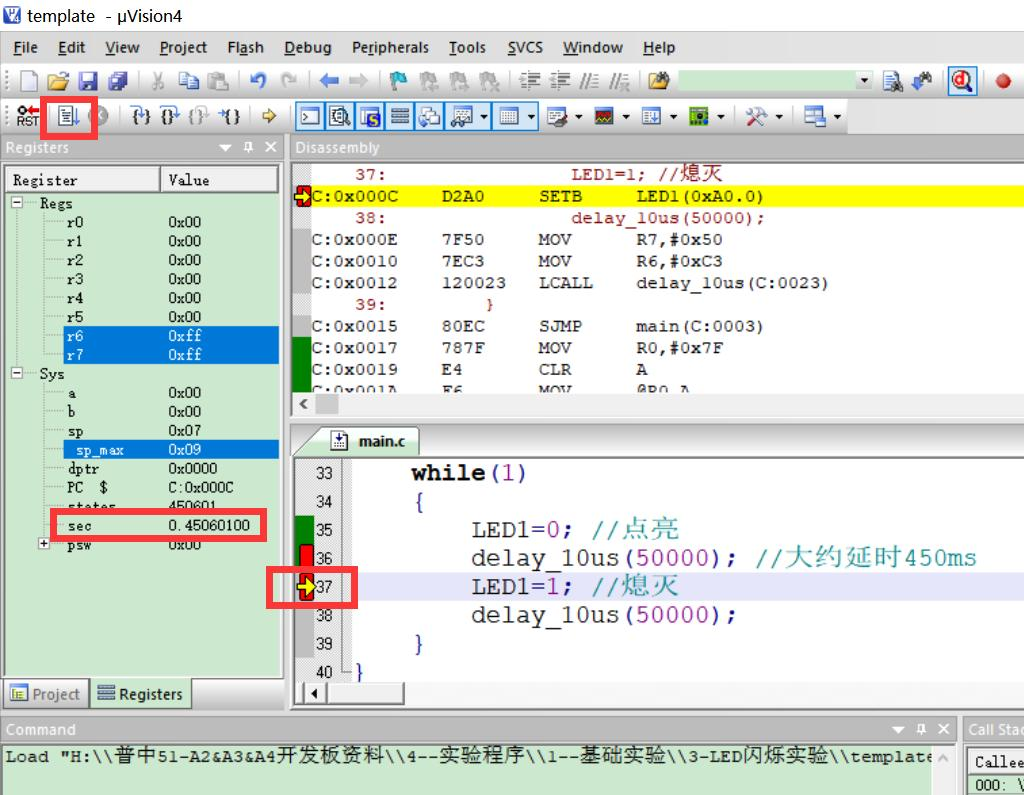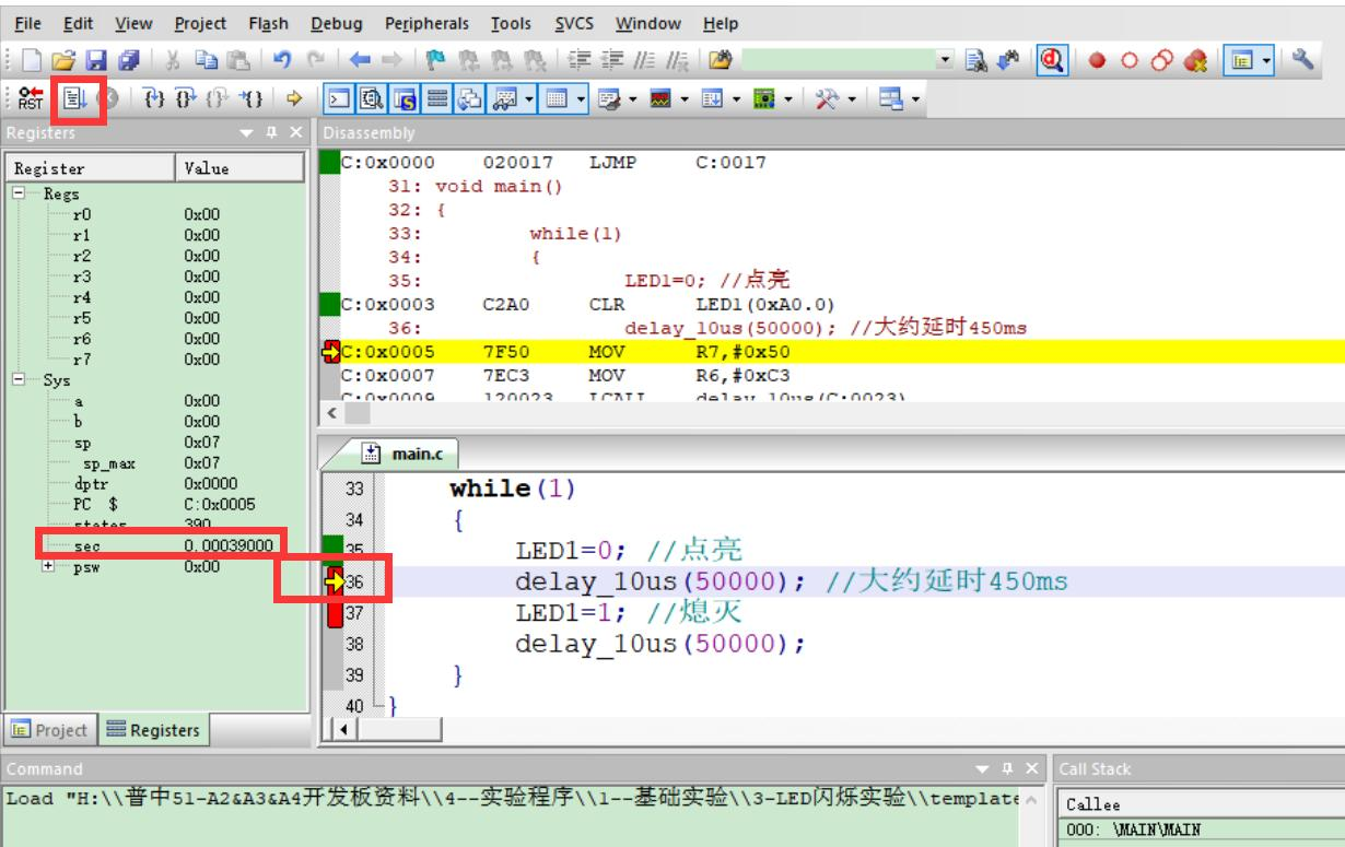 将现在这个时间减去上一步的 sec 时间就可以得到 delay_10us(50000)运行的实际时间了。 再次点击仿真按钮则可退出仿真界面, 回到程序编辑界面。