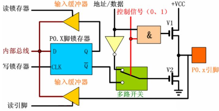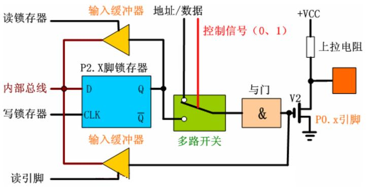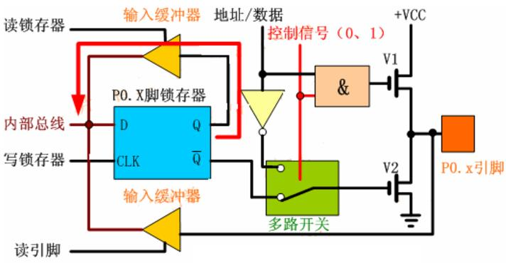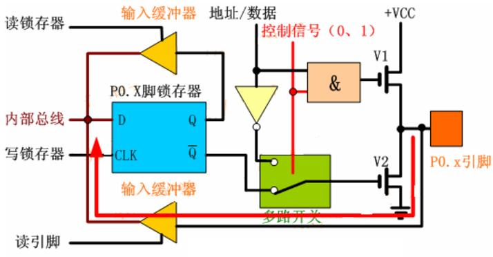 P0 口作为 I/O 端口使用时, 多路开关的控制信号为 0(低电平) , 看上图中的红线部份, 多路开关的控制信号同时与与非门的一个输入端是相接的, 我们知道与门的逻辑特点是"全 1 出 1, 有 0 出 0" 那么控制信号是 0 的话, 这时与门输出的也是一个 0(低电平) , 与门的输出是 0, V1 管就截止, 在多路控制开关的控制信号是 0(低电平) 时, 多路开关是与锁存器的 Q 非端相接的(即 P0 口作为 I/O 口线使用) 。