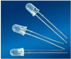 LED 即发光二极管。 它具有单向导电性, 通过 5mA 左右电流即可发光, 电流越大, 其亮度越强, 但若电流过大, 会烧毁二极管, 一般我们控制在 3 mA-20mA之间, 通常我们会在 LED 管脚上串联一个电阻, 目的就是为了限制通过发光二极管的电流不要太大, 因此这些电阻又可以称为"限流电阻" 。 当发光二极管发光时, 测量它两端电压约为 1.7V, 这个电压又叫做发光二极管的"导通压降" 。下图左右分别为直插式发光二极管和贴片式发光二极管实物图。 发光二极管正极又称阳极, 负极又称阴极, 电流只能从阳极流向阴极。 直插式发光二极管长脚为阳极, 短脚为阴极。 仔细观察贴片式发光二极管正面的一端有彩色标记, 通常有标记的一端为阴极。