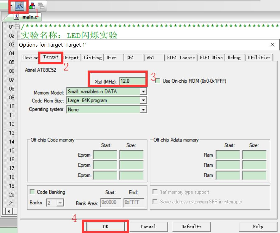①打开实验工程, 点击魔术棒, 选择"Target" 选项卡, 在 Xtal(MHz)文本框中输入 12M, 该值表示开发板上实际使用外部晶振大小, 如果开发板上使用外部晶振是 11.0592M, 则修改为对应值。 然后点击 OK。