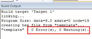 可以看到没有错误, 也没有警告。 从编译信息可以看出, 我们的代码占用FLASH 大小为: 19 字节, 所用的 SRAM 大小为: 9 个字节(9+0) 。 这里我们解释一下, 编译结果里面的几个数据的意义: