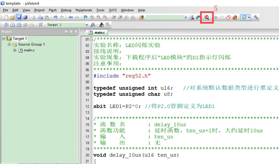 main 函数内实现功能很简单, 在 while 循环内不断间隔一定时间点亮 LED1和熄灭 LED1, 这样即可实现 D1 指示灯闪烁。 细心的朋友可能会问, 前面delay_10us 函数形参为 1 时大约是 10us, 那现在实参传输 50000, 不应该是 500ms吗, 为什么注释写的是 450ms 呢? 这里还得回到刚才话题, 使用循环来延时只是获得一个大概的时间, 并不能精确, 如需精确延时, 后期我们会学习定时器。 此处就不用纠结这个问题。