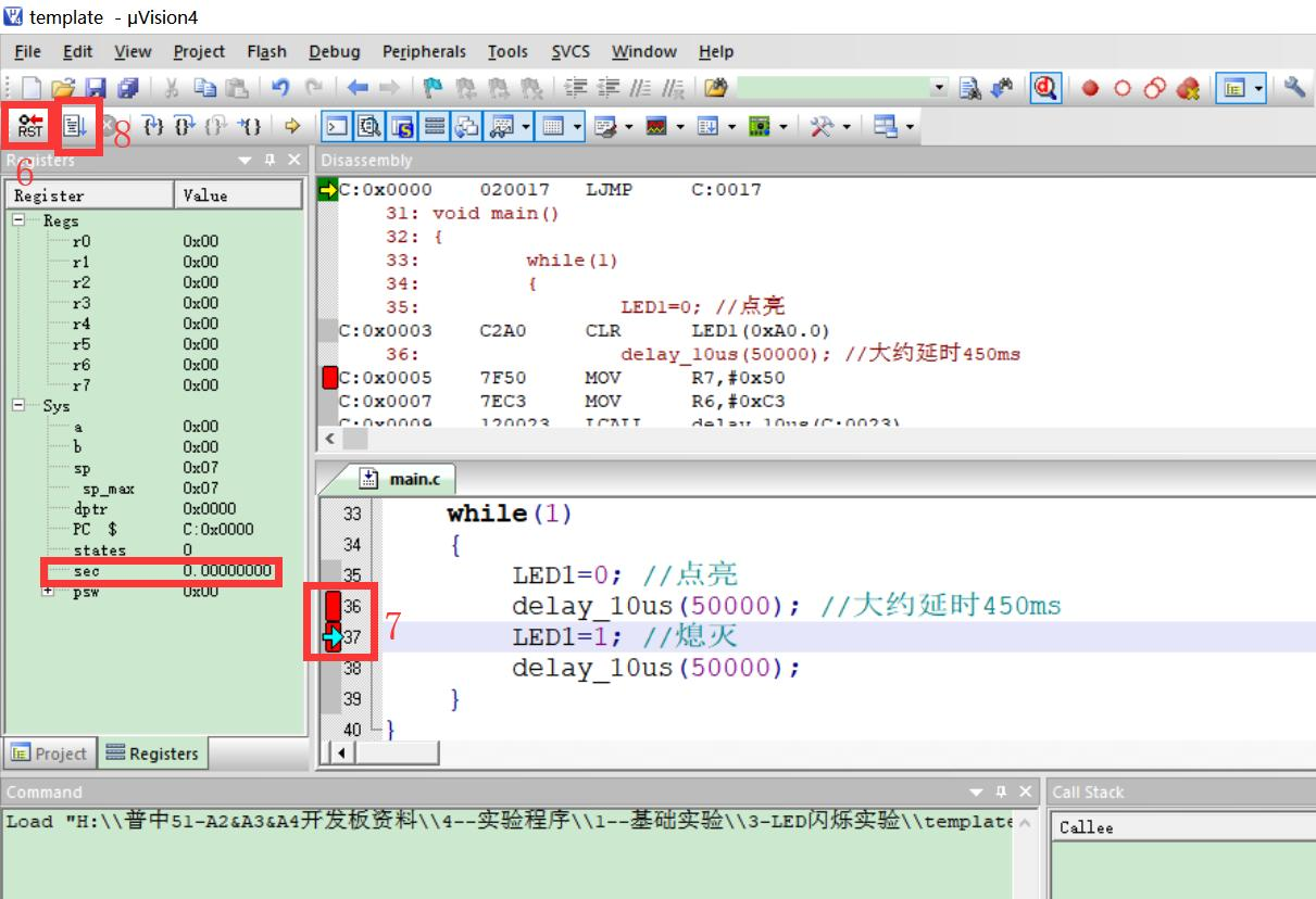 ③点击 RST 按钮, 重新复位系统参数, 此时参数列表中 sec 则为 0, 然后在所要查看调试的代码数字前面用鼠标左键双击即可出现"红色块" , 我们称之为断点。 如果再次双击, 即可取消该断点。 当点击红色标记 8 运行的时候就能直接运行到我们设置的断点处。