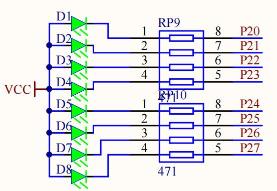 在前面我们介绍过如何查看原理图, 相同网络标号表示它们是连接在一起的, 因此 D1-D8 连接到单片机的 P20-P27 口。 图中 LED 采用共阳接法, 即所有LED 阳极管脚接电源 VCC, 阴极管脚通过一个 470 欧的限流电阻接到 P2 口上。 根据前面 LED 的介绍我们知道, 要让 LED 发光即对应的阴极管脚应该为低电平, 若为高电平则熄灭。