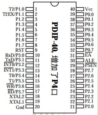 我们开发板上使用的 51 单片机型号是 STC89C52 或 STC89C516, 此芯片共有40 引脚, 芯片引脚图如下图所示: