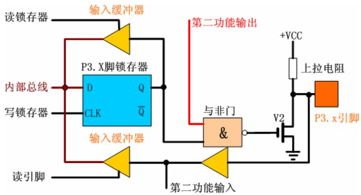 读芯片引脚上的数据, 读引脚数时, 读引脚缓冲器打开(即三态缓冲器的控制端要有效) , 通过内部数据总线输入, 请看下图(红色箭头) 。
