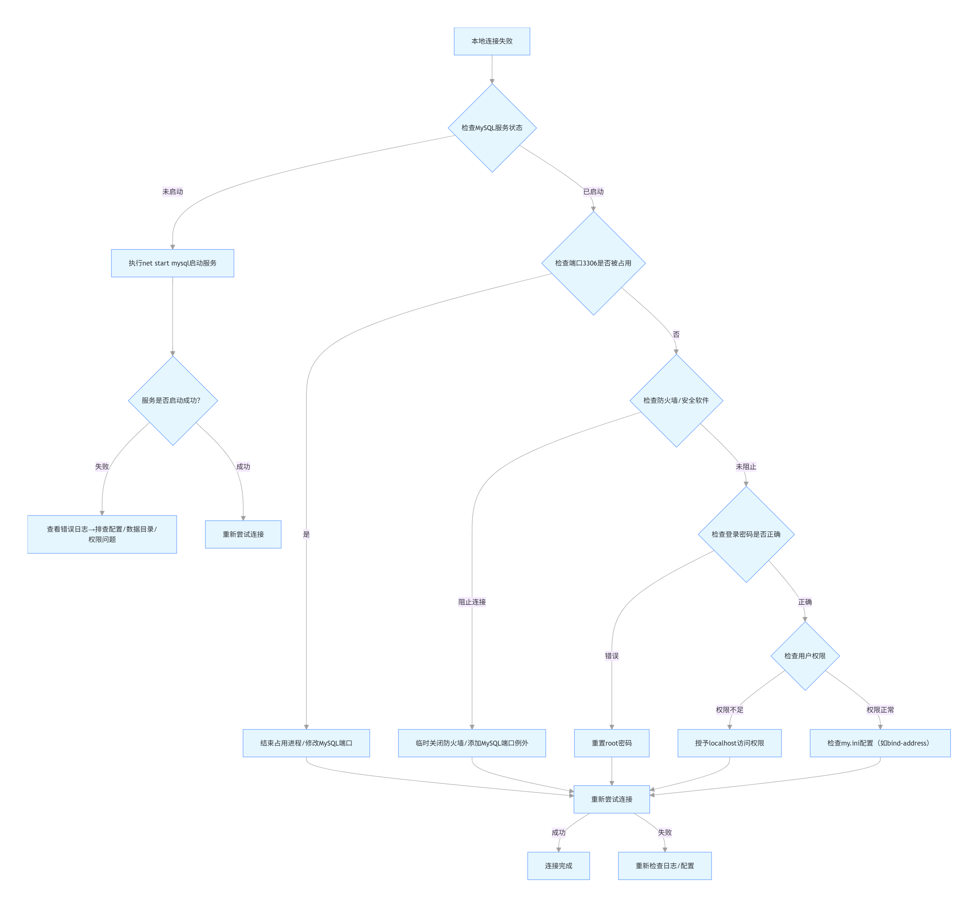 1. 检查 MySQL 服务是否启动;2. 验证 3306 端口是否被占用;3. 关闭防火墙 / 安全软件 | ||
