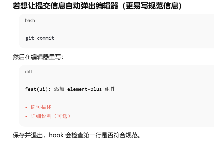 分析 :仓库要求 Conventional Commits(规范化提交信息) 的格式,提交信息必须包含 type(例如 feat/fix/chore 等)和 subject(简短描述)。