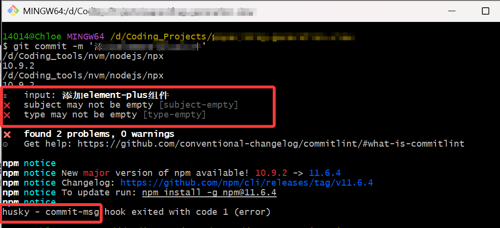 husky - commit-msg hook exited with code 1:表示 hook 检测不通过,退出码为 1,所以 Git 阻止了提交。
