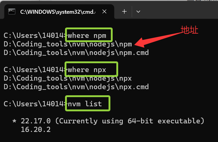 where(Windows 命令)能找到D:\Coding_tools\nvm\nodejs\npm。
