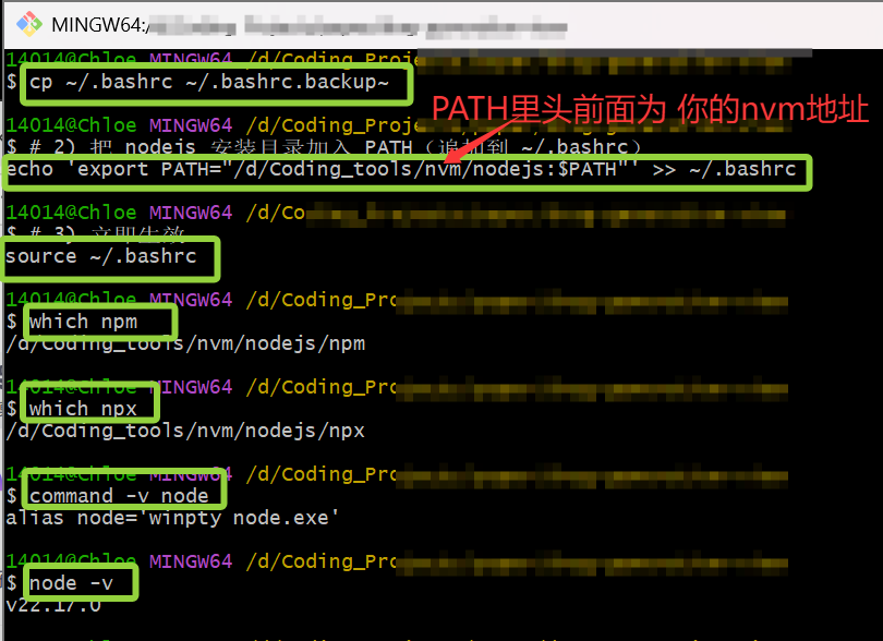 D:\Coding_tools\nvm\nodejs\...,这个路径已在 Windows 命令行的 PATH 中,但 Git Bash 的 PATH 没包含这个目录;