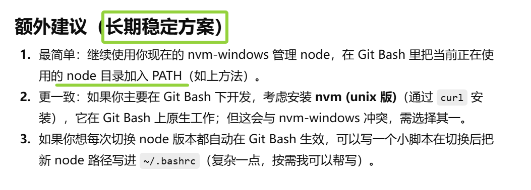本质 :cmd 能找到 node/npm/npx/nvm(nvm-windows) ,但在 Git Bash 看不到 ,所以 Git Bash 的****PATH 没把 【 NVM for Windows 的 node 目录 】包含进来;
