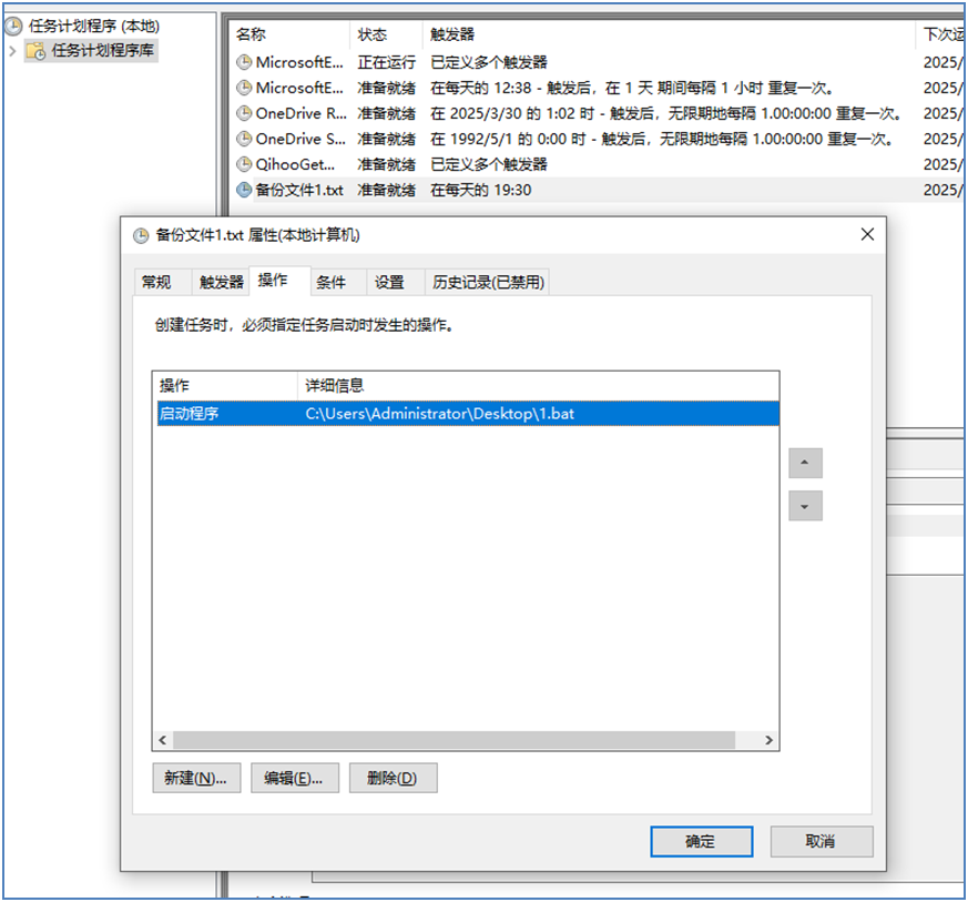 右击"任务计划库"---选择"创建任务"。在"常规"中设置"名称"为"备份文件1.txt"。在"触发器"中点击"新建",在弹出窗口中设置每天某个时间执行任务。在"操作"中点击"新建",在弹出的窗口中点击"浏览",找到执行任务的bat文件,打开。在"条件"选项卡中去掉"只有在计算机使用交流电源时才启动此任务"的勾选。最后点击"确定"。如下所示: