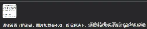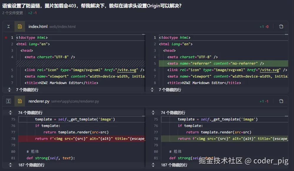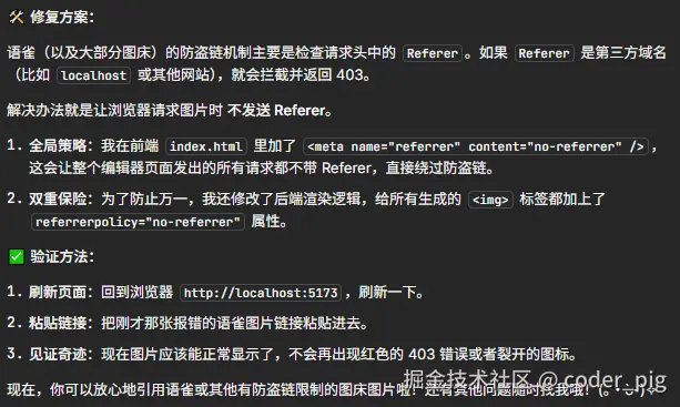 继续 Vibe ,发现图片加载不出来,😄 这种大概率是 "图片防盗链 ",一般是检查 请求头 中的 Referer ,如果是 第三方域名 ,就会返回 403: