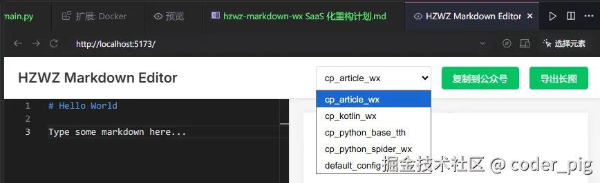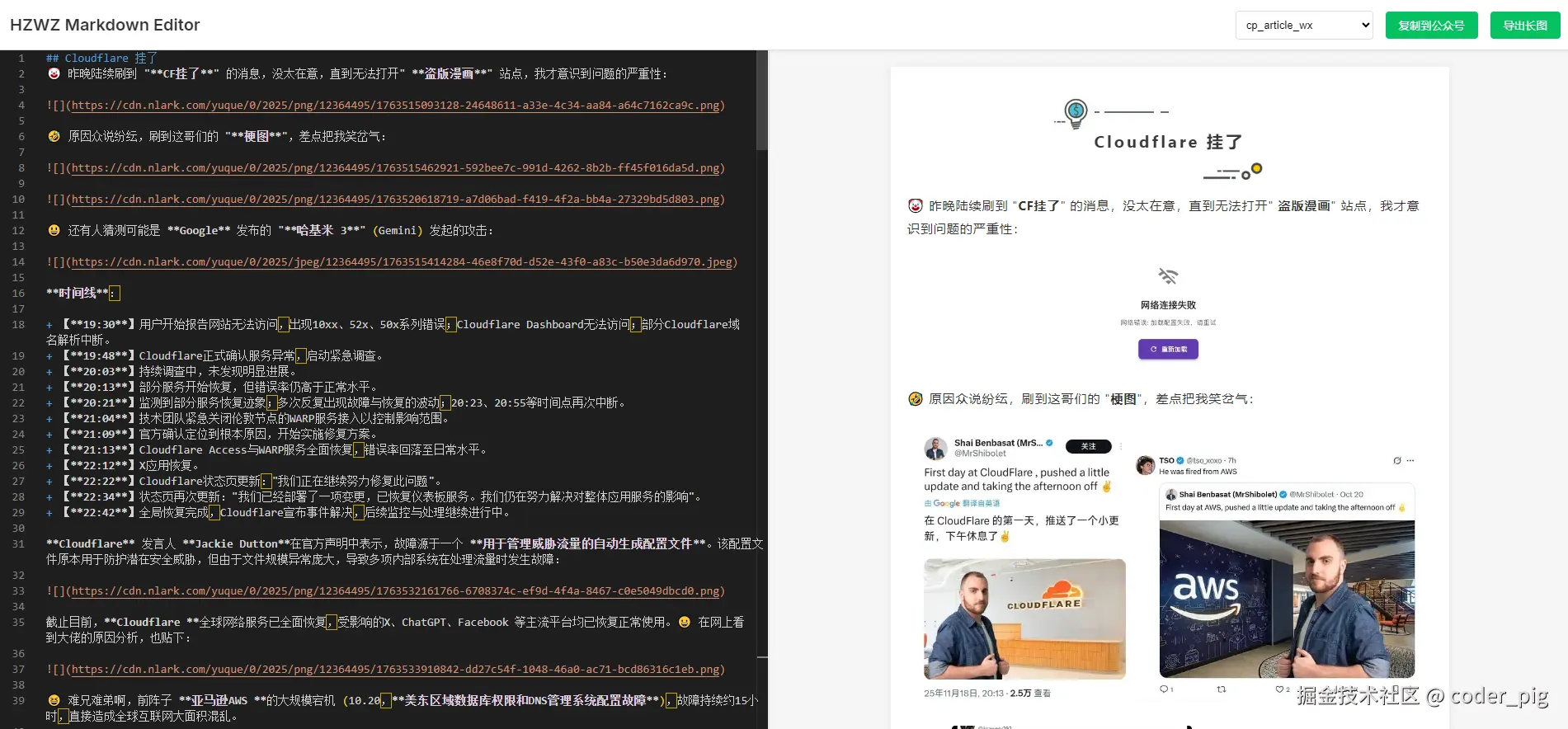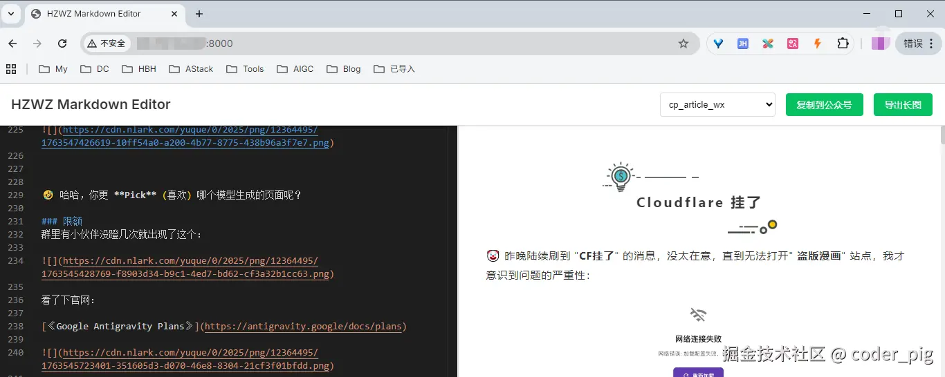 四年前,百无聊赖之余,一时兴起,花了差不多一周,用 Python 写了个 "🐭 尾汁Markdown转换工具 " → coder-pig/hzwz-markdown-wx,用于:将Markdown文件转换成带样式的微信公众号文章HTML。