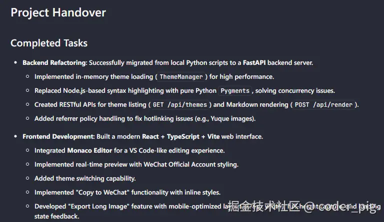 🤔 短文章还好,长文章样式全乱套 (比如:无序列表加粗文本,会显示成 xx ),换了好几个模型,Vibe 了N次都没改好,问题越搞越多,前端这块,我又不是很熟,无奈放弃🤷♀️。后面还是用回了「Doocs」: