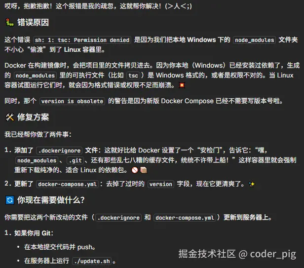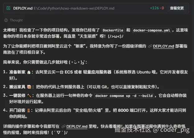 🤷♀️ 不过这是偶现,感觉是哈基米的问题,临时的简单解法就是:再让 AI 转换成中文的。后端重构 + 前端开发 完成,接着就是部署到 云服务器 上了。不懂就问: