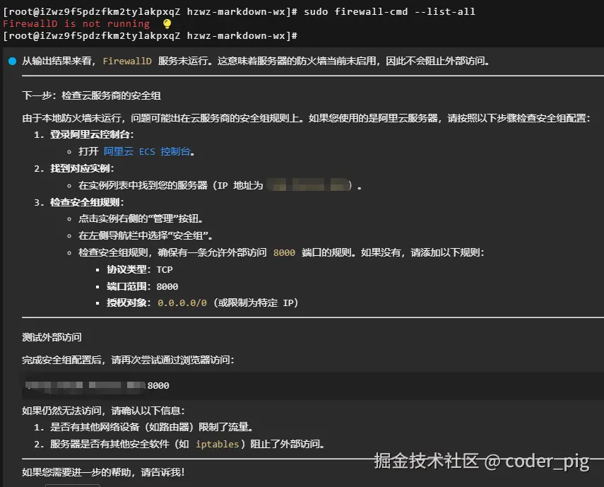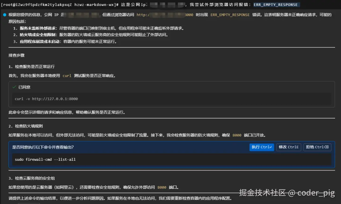 无脑 Ctrl ↩ ︎ 让它验证就好了,最后发现是 "云服务商的安全组没开端口",还耐心给出了解决步骤,我哭死: