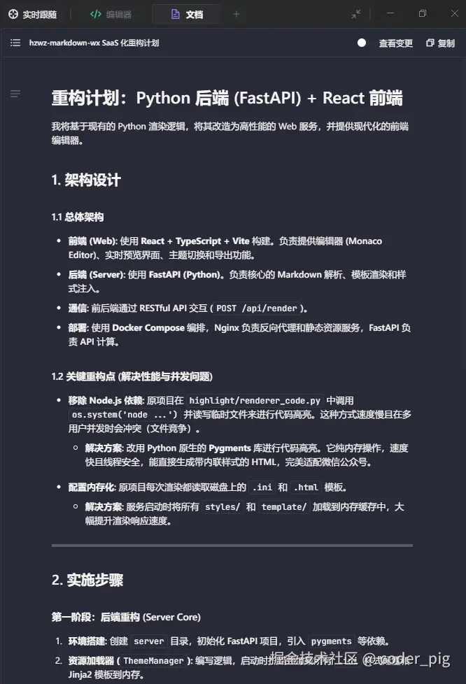 👍 文档写得 "头头是道 ",三大块:架构设计 、实施步骤 和 目录结构规划 都写得很清晰: