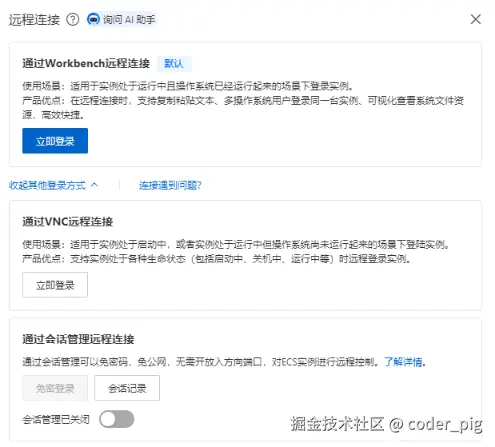 照着文档操作一波,这个 99块/年 的云服务器吃灰近一年了,发现多了个 "Workbench 远程连接" 的方式: