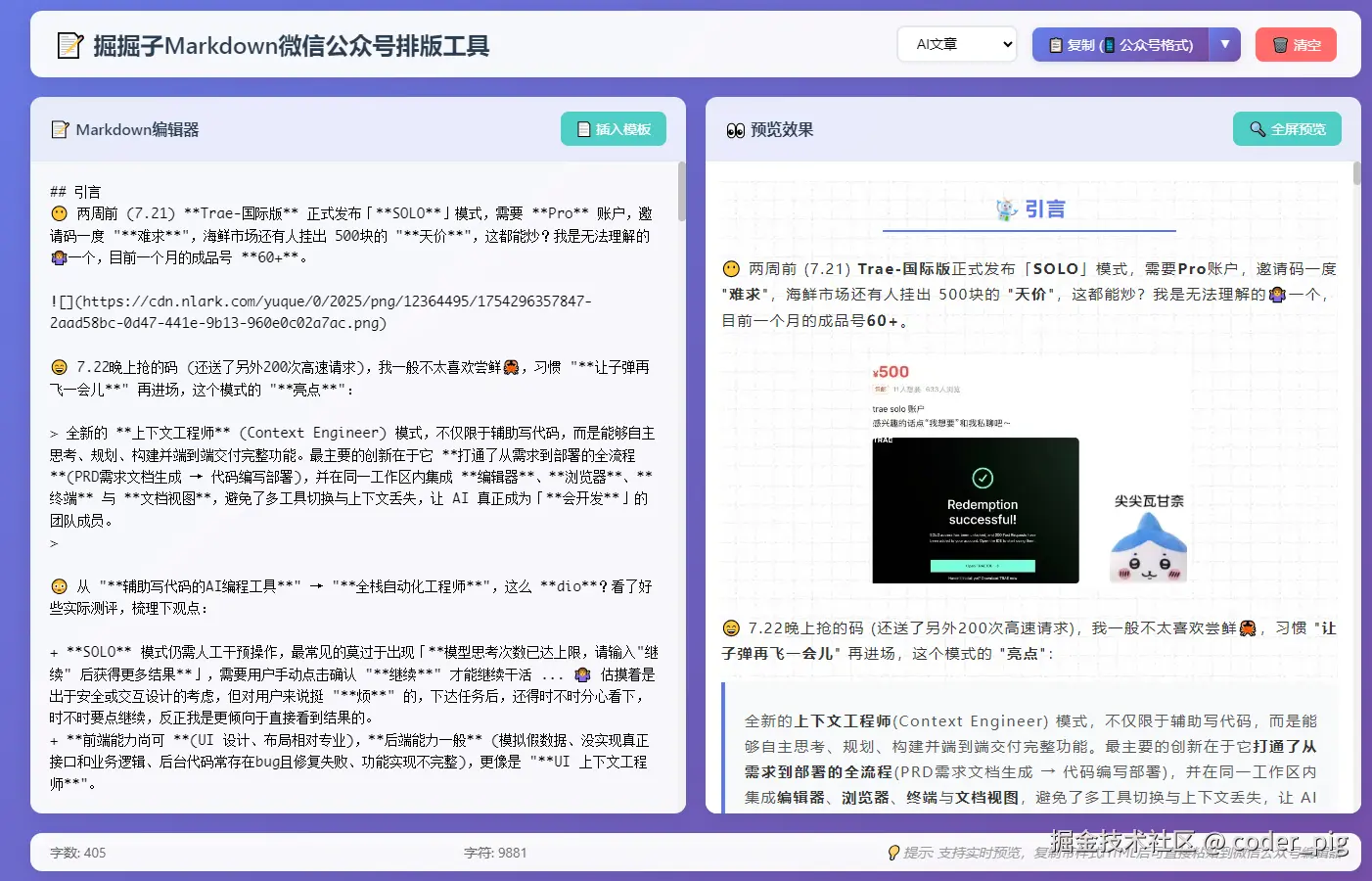 😄 今年六月,看 首月3刀 开的 Trae 还剩挺多额度,于是花了半个小时,Vibe 了一个 排版静态页面, 并且用 掘金MCP 进行发布 → 「掘掘子Markdown微信公众号排版工具」
