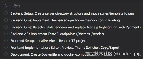 按需进行修改,确定无误后,点解 "执行 ",然后 Trae 会拆解成多个小任务 (Todo-List),逐一完成: