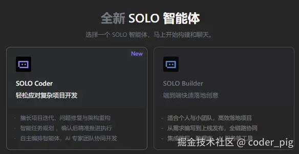 - 「内置两类智能体能力升级 」SOLO Coder - 专精复杂工程任务:重构、调试、多文件跨模块修改,具备持续上下文理解能力,更适合中大型项目。SOLO Builder - 为快速构建产品原型而设计:界面、应用、后端都能快速产出初版,支持从 0→1 的自动化 Scaffold (脚手架) 与逻辑生成。