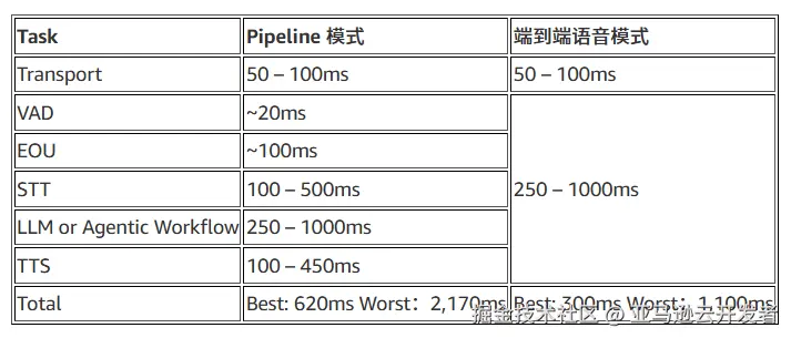 典型的Pipeline模式和端到端语音模型延迟对比如下(请注意,不同方案和组件的延迟差异较大,以下数据仅供参考)。在设计智能语音Agent时,将语音端到端延迟控制在800至1000毫秒是一个不错的目标。