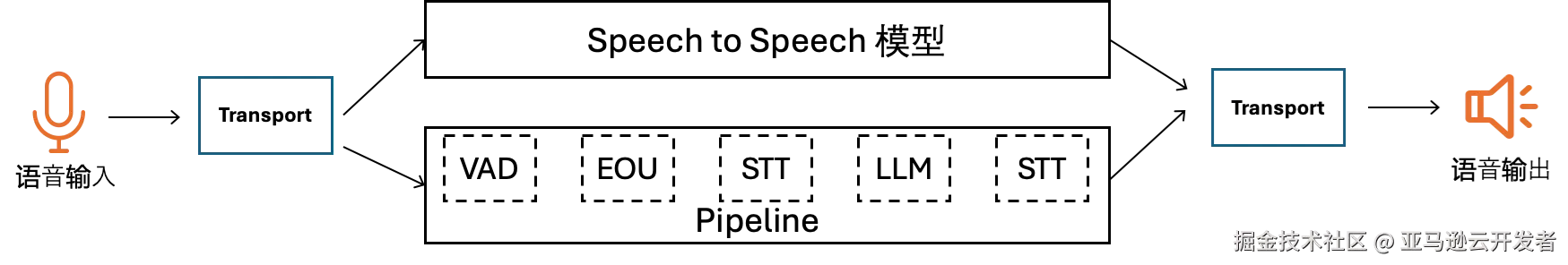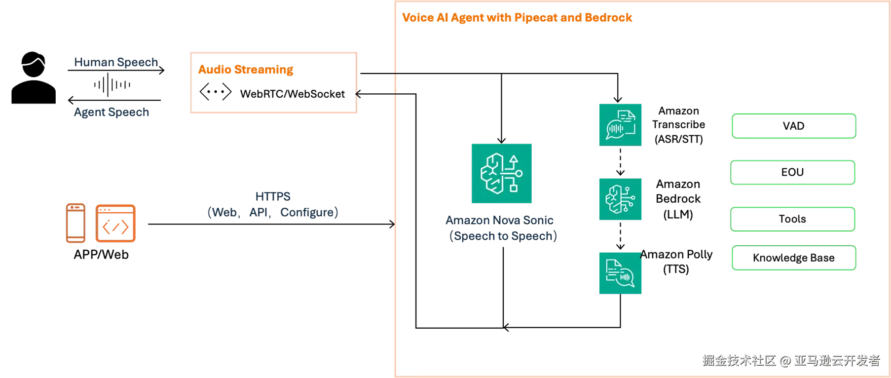 通过将上述组件组合成一条Pipeline,即可构建出智能语音Agent。随着生成式AI技术的进步,业界发展出了端到端语音模型(即Speech to Speech语音模型),该模型可实现语音输入到语音输出的全链路处理,例如Amazon Nova Sonic就是一款由Amazon研发的Speech to Speech语音模型。端到端语音模型内置了VAD、EOU、STT、LLM、TTS等集成功能,能够实现更低的延迟。这类模型使得构建语音Agent更为轻松便捷。