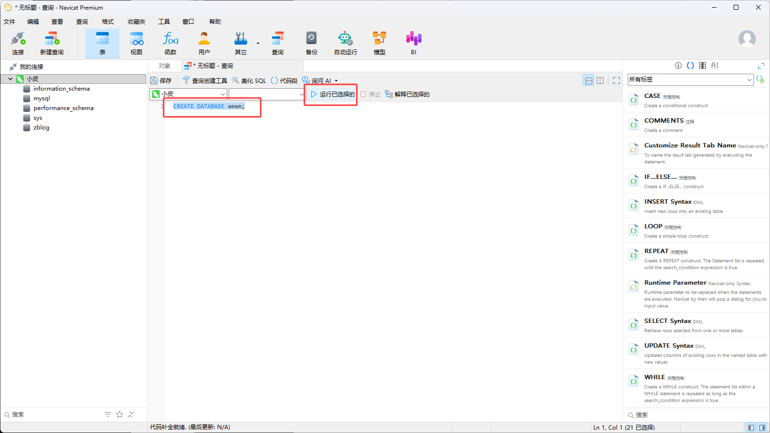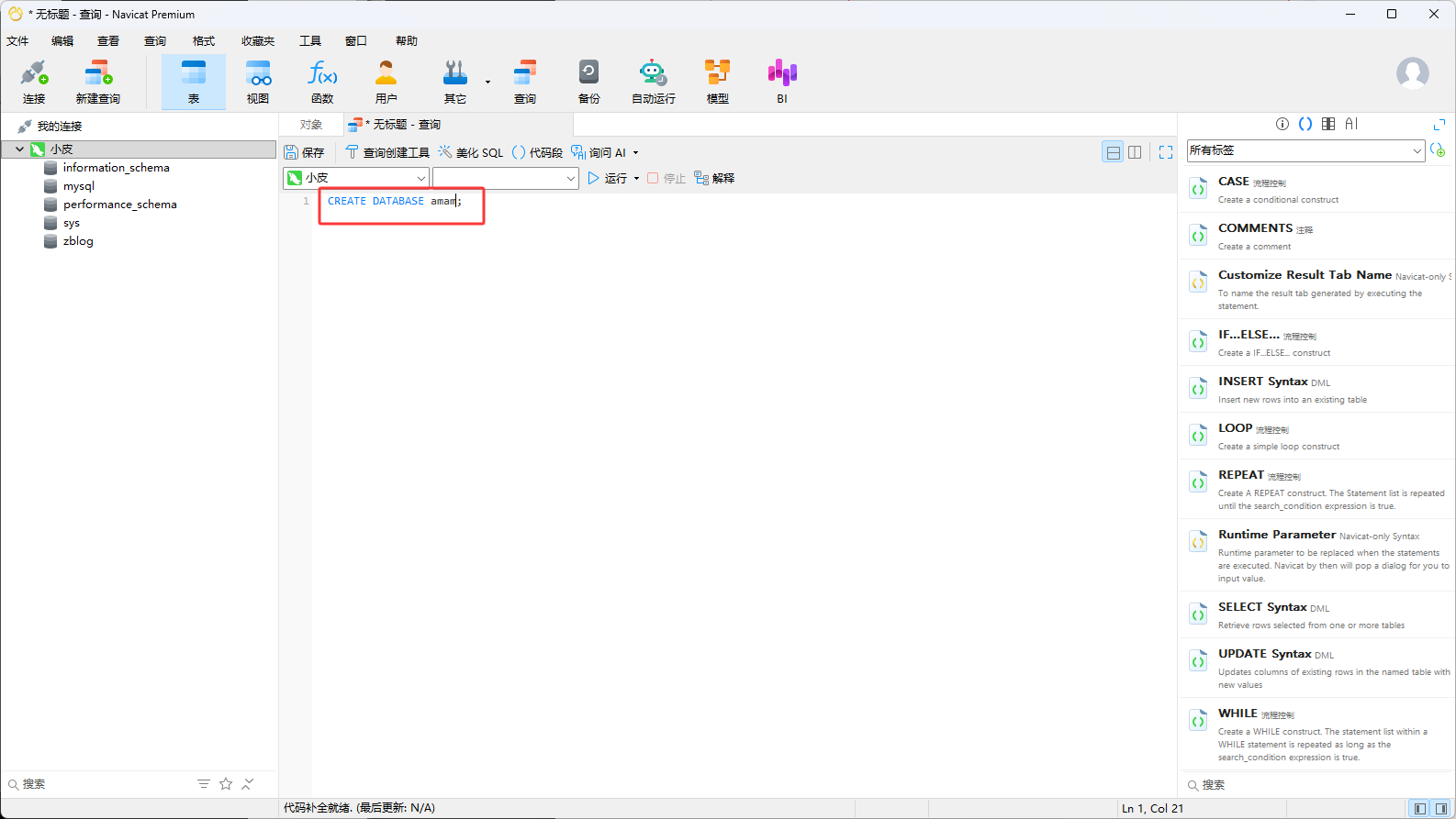 在下图红框位置就可以输入MySql的代码了,也就是数据的管理语句