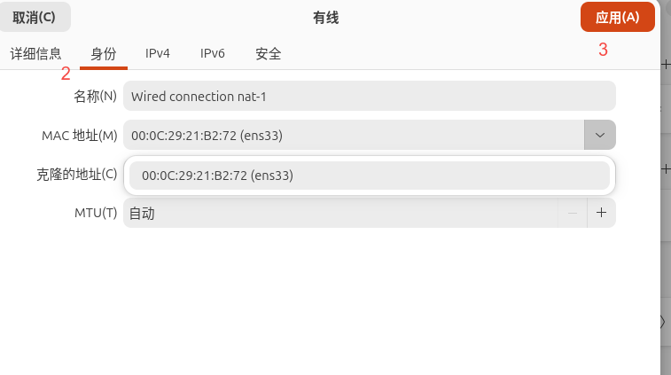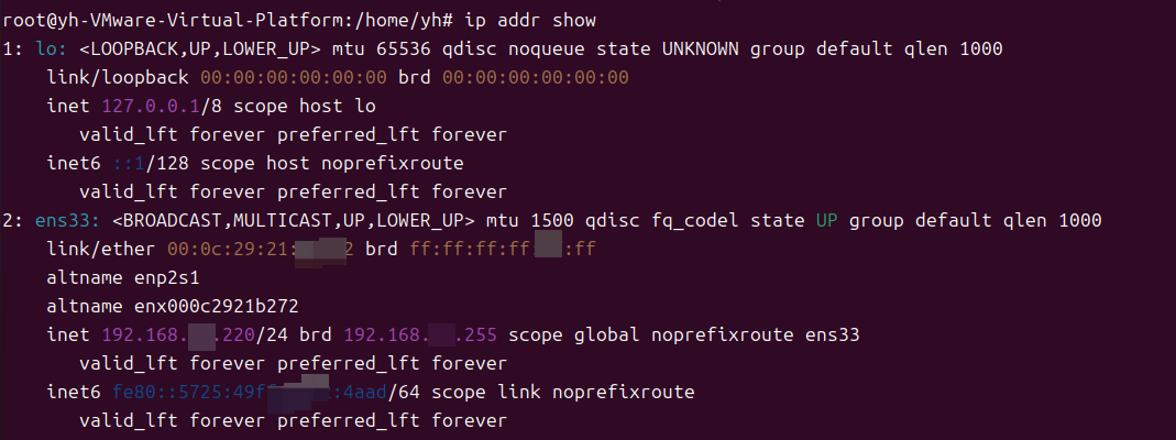 - 虚拟机设置-》网络适配器-》高级-》MAC地址(这个地址需要与ip addr 显示ens33的mac一致)