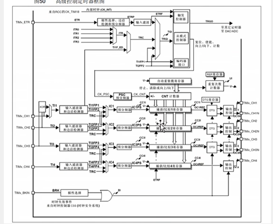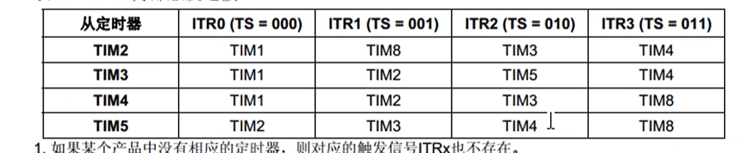 外部时钟模式1的输入可以是ETR引脚、其他定时器、CH1引脚、CH2引脚;